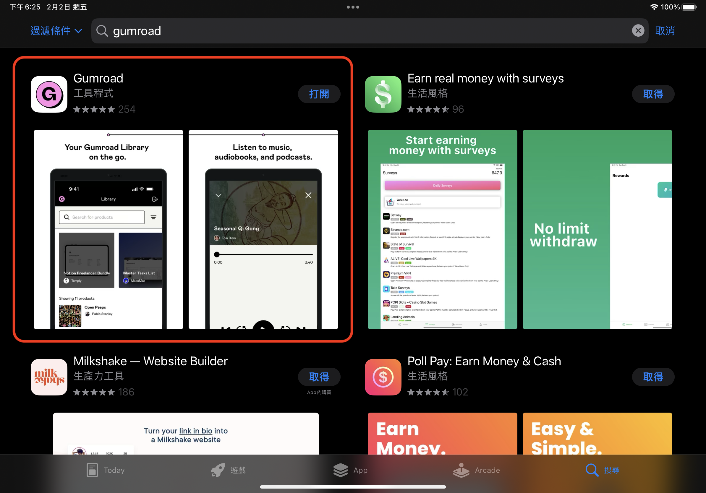 在Google Play (連結) 或是 App Store 裡面找到 Gumroad: