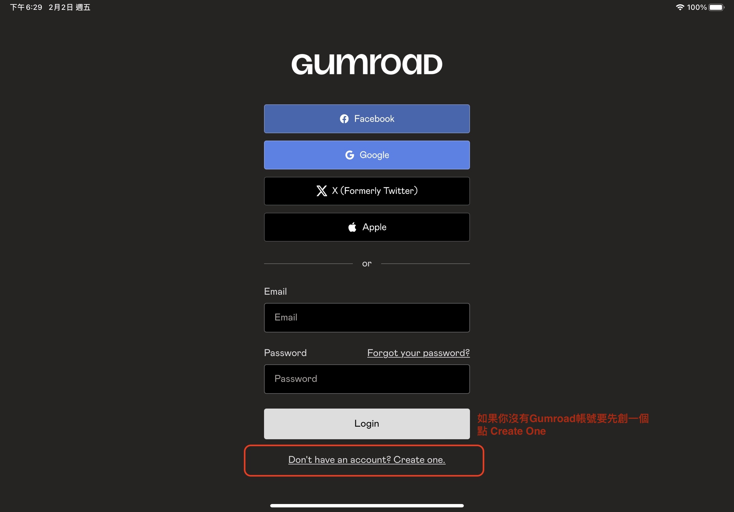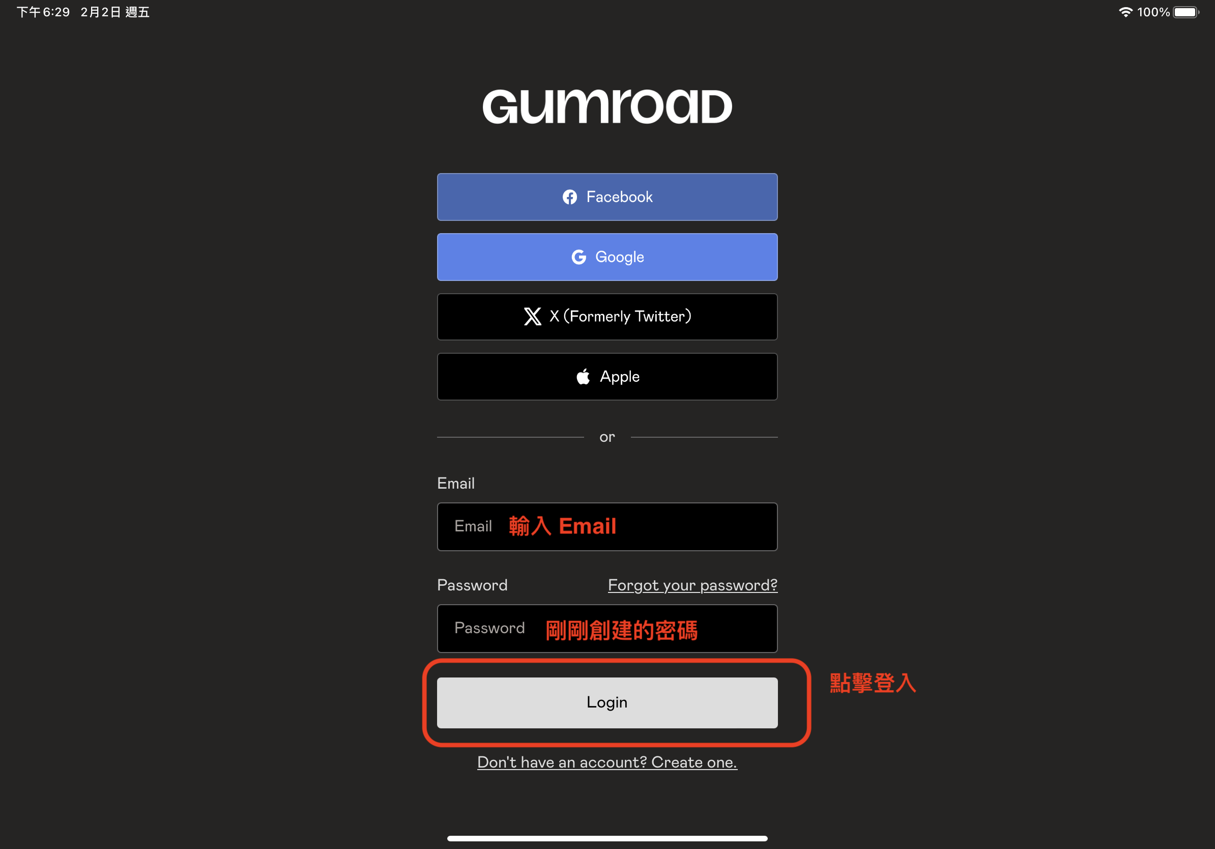 下載 App 之後先不要點登入,要點登入下面的 Create one 「創造一個帳戶」