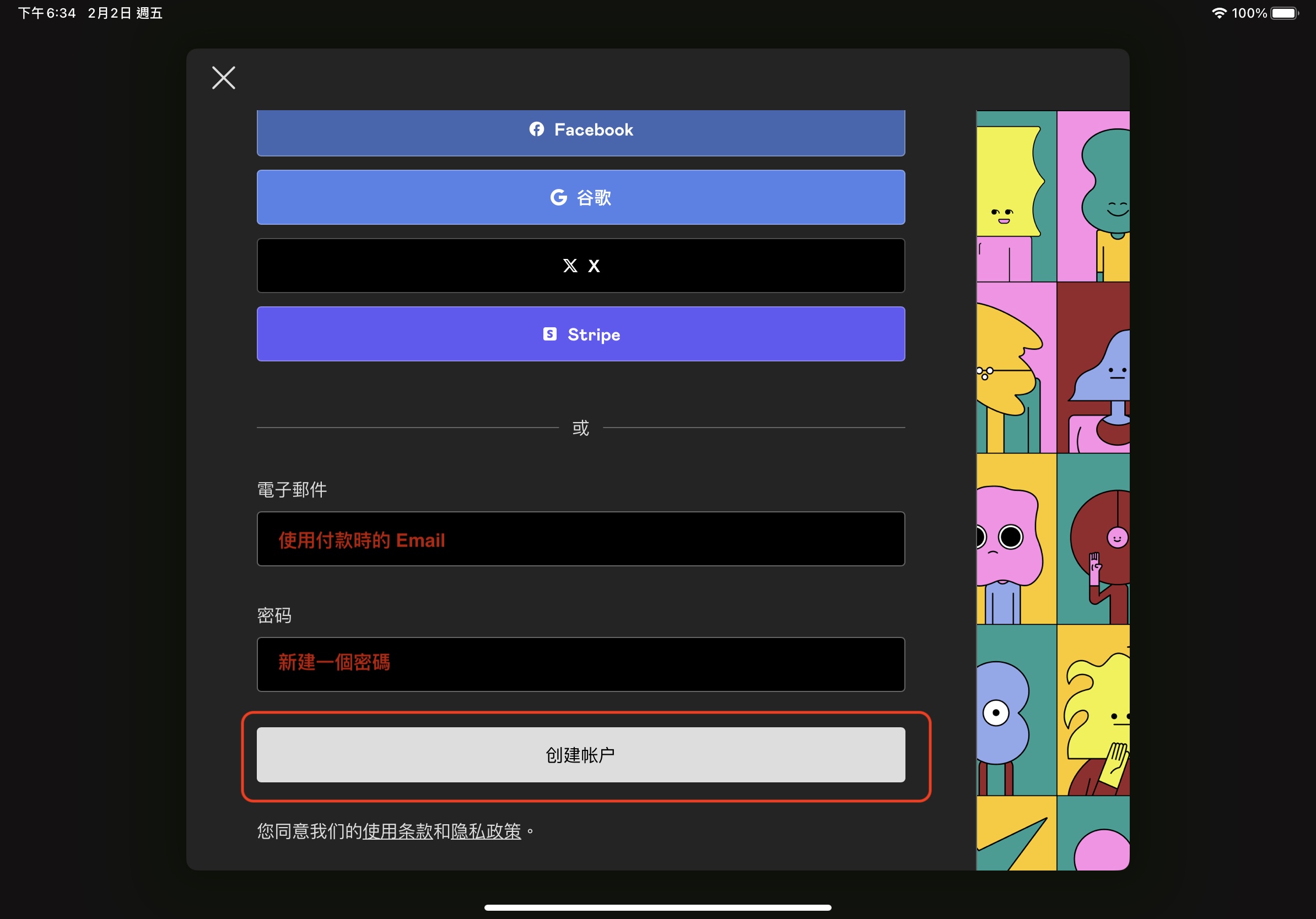 請用「訂閱時用的 Email」,並創造一個你記得的密碼,然後按「創建帳戶」