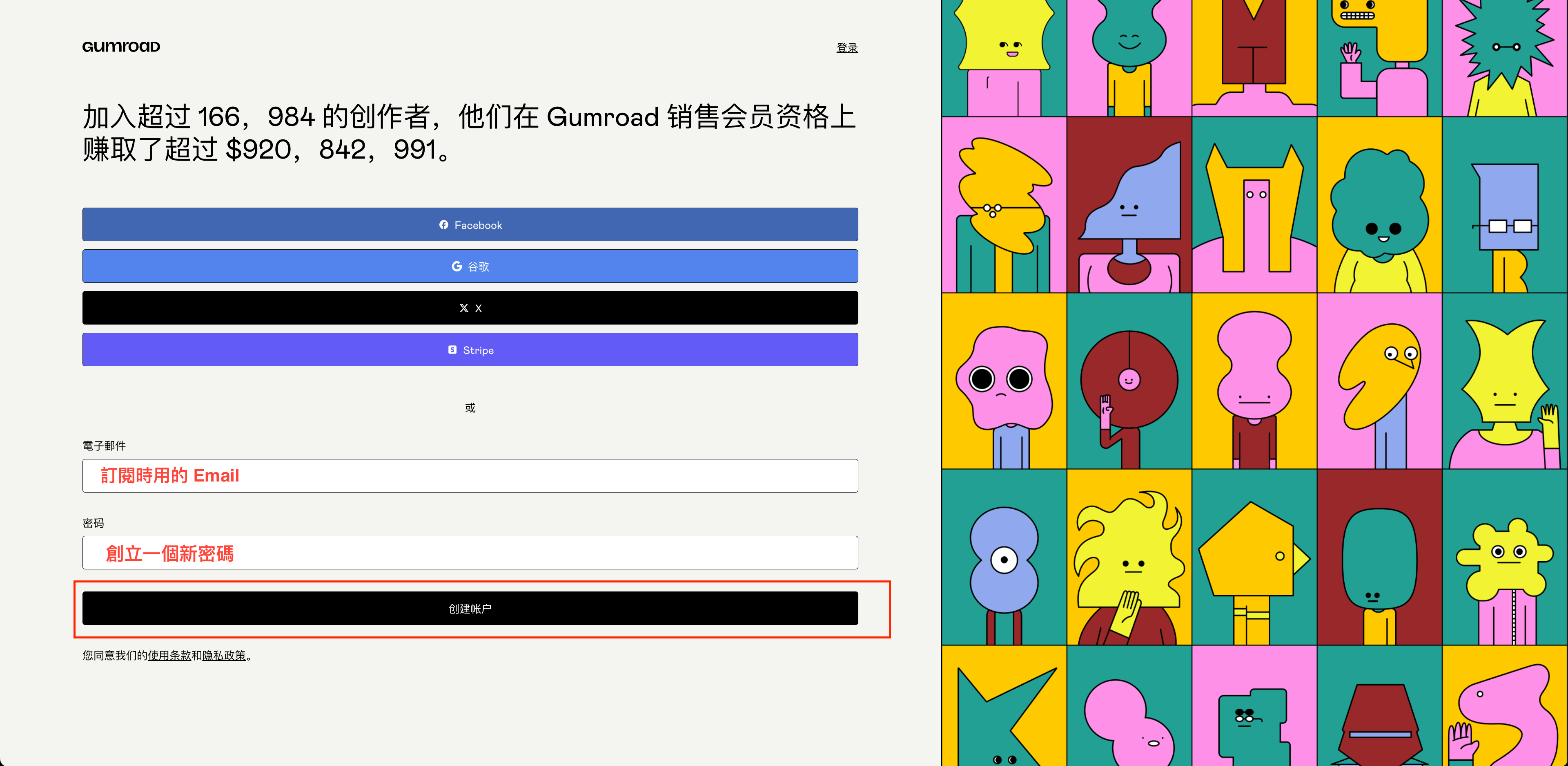 請用「訂閱時用的 Email」,創立一個新密碼。創立新帳戶: